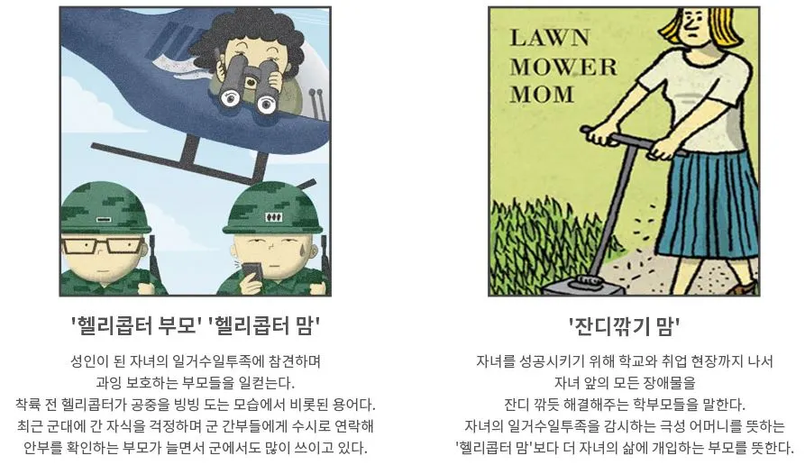 물론 지금은 아이가 직접 하는 것보다 부모가 대신해주는 것이 편합니다. 그러다 보니 요즘에는 준비물이나 과제는 물론 친구 관계까지 관여하기도 합니다. 그 결과 대학교나 직장에 가서도 자녀의 삶을 관리해주는 부모도 요즘 부쩍 많아졌습니다. 회사도 “아이 부서를 바꿔달라, 왜 우리 아이 야근을 시키느냐?, 아이가 오늘 아파서 결근한다”는 등 내용으로 직원의 부모 전화가 종종 온다고 합니다. 일명 헬리콥터처럼 주위를 돌며 감시한다고 해서 붙은 ‘헬리콥터 맘’에서부터 자녀 앞의 장애물을 모두 없애준다는 의미의 ‘잔디깎이 맘’들은 아이를 사랑한다는 이유로 아이의 자립을 막는 셈입니다.