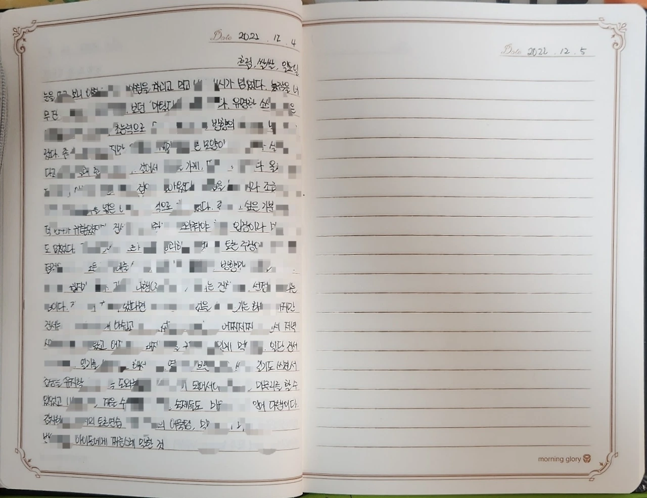 다른 일들은 크게 문제가 되지 않았습니다. 그런데 일기장을 펴는 순간 저는 소스라치게 놀라고 말았습니다. 제가 지난 월요일인 12월 5일부터 일기를 쓰지 않았다는 것을 깨닫게 된 것이죠. 어제가 일요일이었으니 딱 일주일만큼 미뤄놓고 있었던 겁니다. 회식을 했던 월요일에 2호의 토론 준비를 돕고 바로 뻗었으니 그때부터 쓰지 않은 게죠.