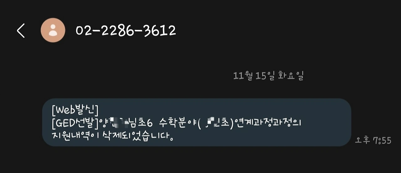 그런데 신청서를 낸 뒤 며칠 뒤 담임선생님께 전화로 연락이 왔습니다. 말씀해주신 내용인즉슨 이번에 아이들이 지원한 6학년 수학과정은 5학년 수학 영재교육을 수료한 학생들에게만 지원자격이 주어지는 연계과정이어서 저희 아이들은 신청할 수 없었던 것이었습니다. 그 말을 전해 듣고 저는 교육지원청 담당자와 통화까지 한 뒤에 지원 취소를 해야만 했습니다.