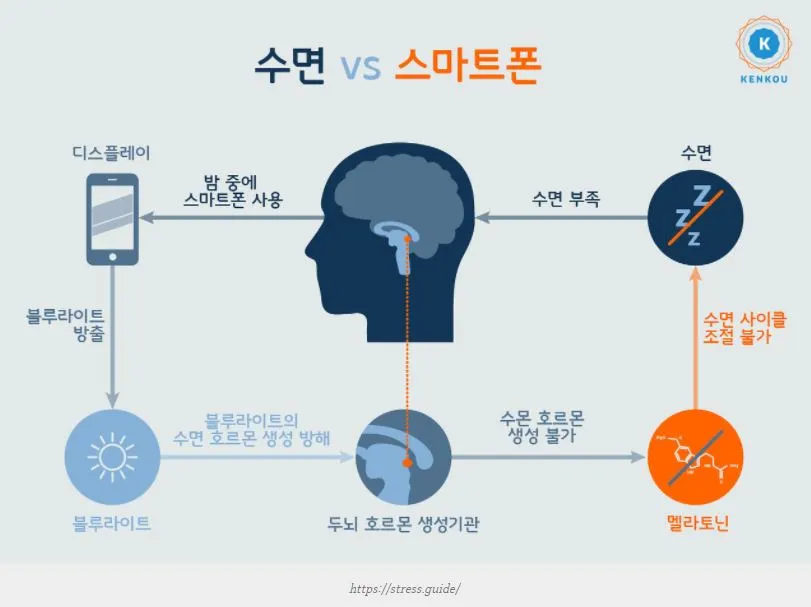 놀랍게도 빛은 WHO에 의해 2급 발암물질로 지정되어 있습니다. 멜라토닌 분비를 방해하기 때문입니다. 밤에 자기 전에 스마트폰을 보지 않는 부모는 거의 없습니다. 문제는 이 불빛에 2시간 이상 노출되면 멜라토닌 호르몬의 분비가 약 22% 억제된다는 사실입니다. 인체의 생체리듬을 조절하는 수면 호르몬인 멜라토닌은 우리 몸이 밤에 잠들 수 있도록 하는 역할을 합니다. 두뇌의 노화를 늦출뿐더러 염증이나 암세포와 싸우는 강력한 항산화제이기도 합니다.