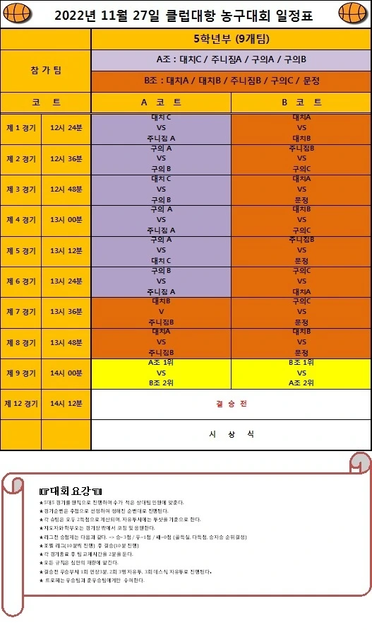 그렇게 나름대로 몸과 마음의 준비를 마치고는 드디어 대망의 농구대회 날 아침이 밝았습니다. 대진표나 행사개요는 아내가 가지고 있어서 저는 뒤늦게 확인하게 되었습니다.