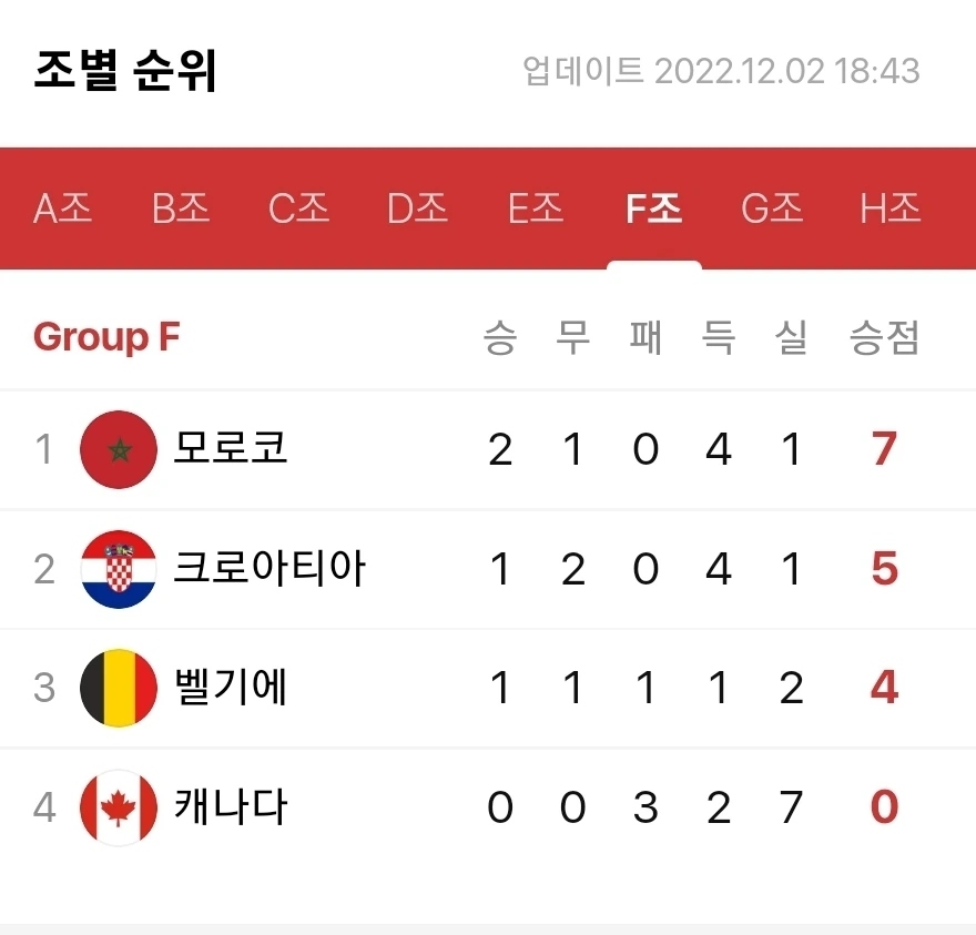 모로코, 크로아티아에 이어서 조 3위를 차지해 조별예선을 탈락하고 말았습니다.