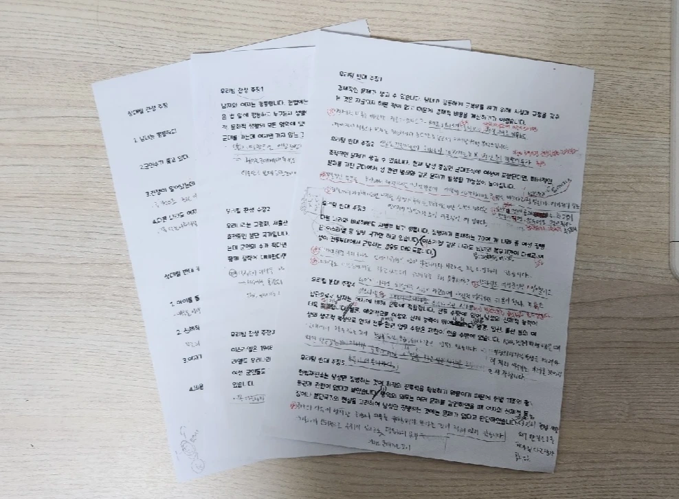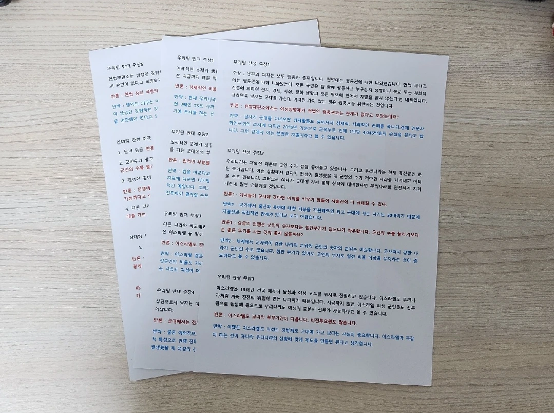 2호가 팀과 팀원이 드디어 정해졌다며 돌아와서 이야기해주길래 그때부터 특훈(?)이 시작되었습니다. 여성이 군대에 가야 하느냐에 대한 개인적인 주장과는 별개로 이 토론 배틀에는 모든 주장에 논리를 다 갖춰야 하기에 꽤 많은 준비가 필요했습니다.