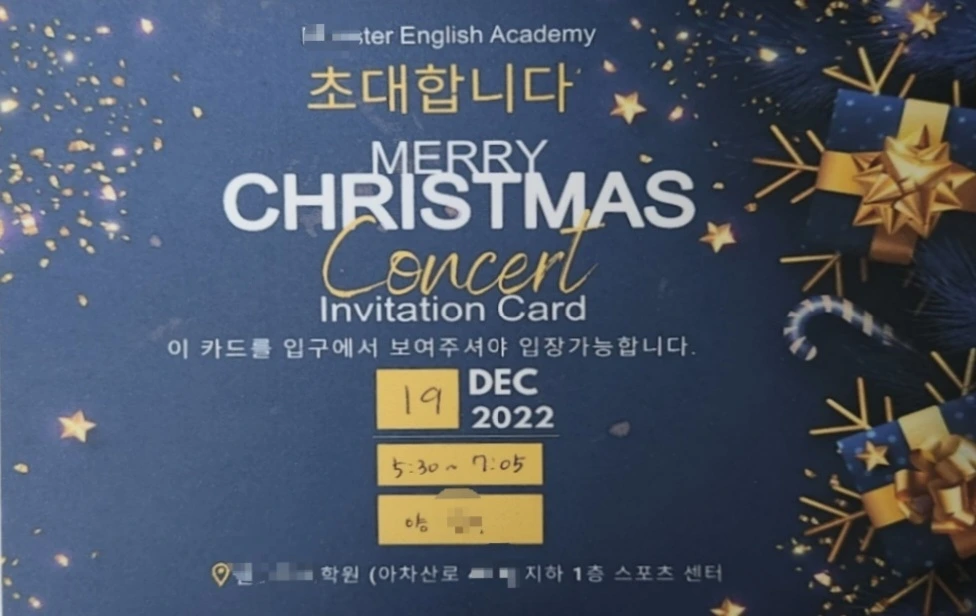 요즘에는 이런 초대장이 유행인 모양입니다. 학교에서도 초대장을 가진 학부모님만 올 수 있게 하더니 학원에서 이 초대장이 있는 부모만 들어갈 수 있게 되어있다고 합니다. 관심이 많은 집은 조부모님들까지 오는 경우가 많아서 만든 고육지책이라고 합니다.