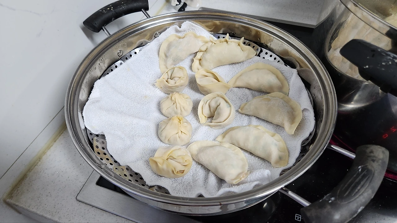 이걸로 끝이 아니었습니다. 이제는 초벌구이처럼 찜기로 빚어놓은 만두를 모두 쪄야 합니다. 저는 반죽이 된 상태에서 바로 냉동실에 넣는 줄 알았는데 그것이 아니었던 모양입니다.