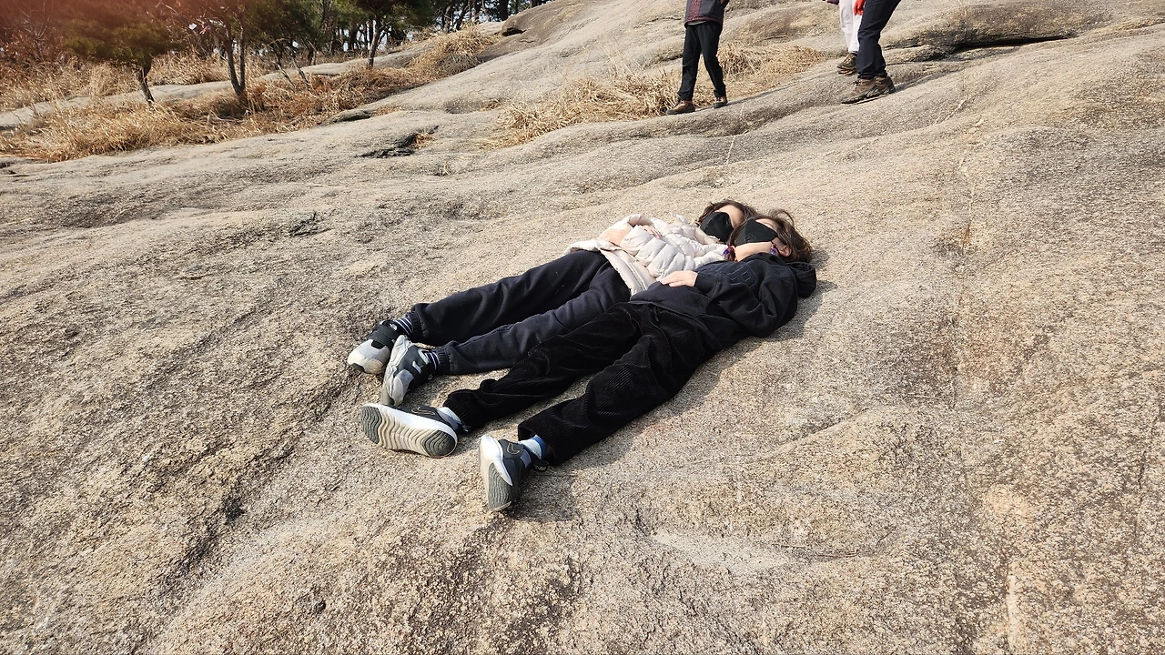 생각보다 날씨가 좋았습니다. 미세먼지도 보통, 기온은 영상이었으니 말이죠. 가벼운 옷차림으로 나왔음에도 금세 몸이 더워지기 시작했습니다. 초급자들의 최종 목적지인 고구려정에 도착해서 좀 쉬었네요. 아이들도 함께 쉬는데 술 취한 아저씨들 마냥 자기 집 안방처럼 누워있네요.