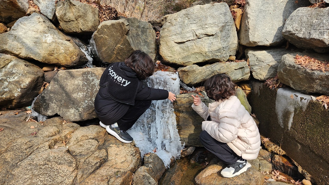 이제 바로 집으로 내려가면 되지만 아이들은 자연이 만들어준 놀이터를 그냥 지나칠 생각이 없었던 모양입니다. 계곡에 얼어있는 얼음 깨기 삼매경에 정신이 없습니다. 저도 함께 돌멩이를 구해서 얼음 깨기에 동참합니다.