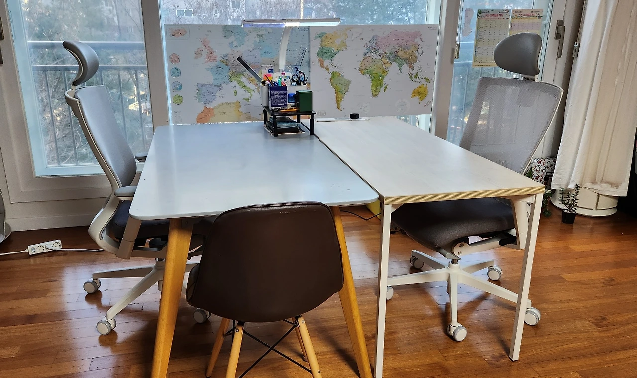 바로 거실에 책상을 합쳐서 다시 거실에서 공부를 하게 하도록 아이디어를 낸 것이죠. 책상의 너비나 높이가 큰 차이가 없습니다. 기가 막히네요. 이렇게 가구의 배치를 새로 하고 나니 아이들도 만족스러워합니다. 원래 제가 쓰던 자리를 양보해야 했지만 대승적으로 받아들이기로 했습니다.