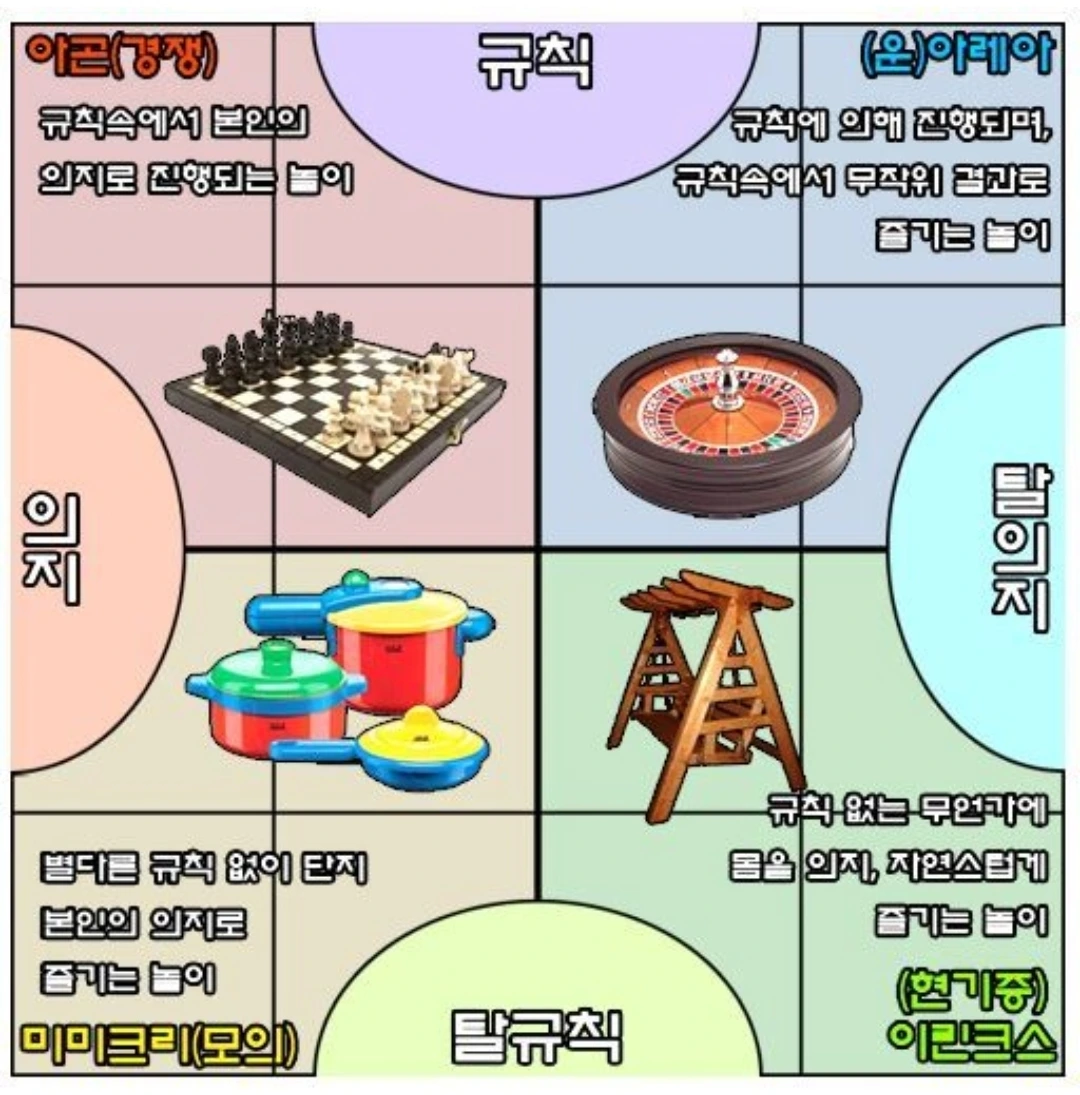 이러한 분류를 체계적으로 정리한 것이 <놀이와 인간>의 저자 로제 카이와 입니다. 그는 놀이를 네 가지 특징으로 크게 네 가지로 분류했습니다.