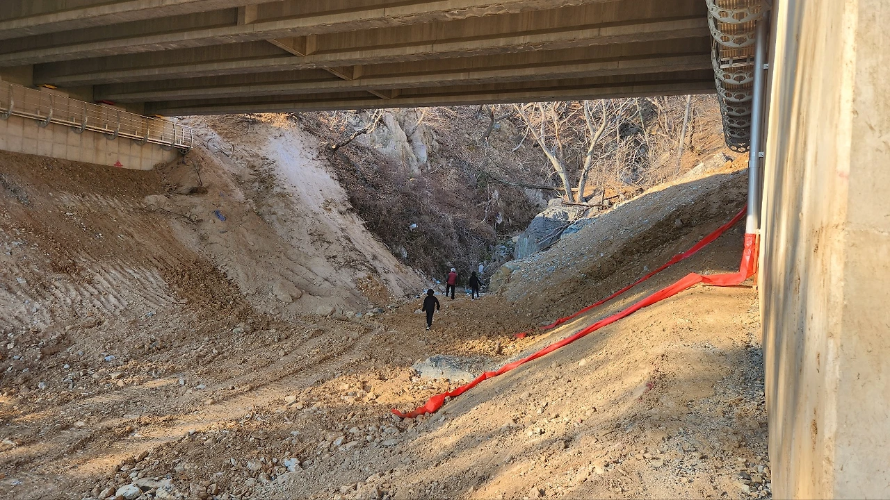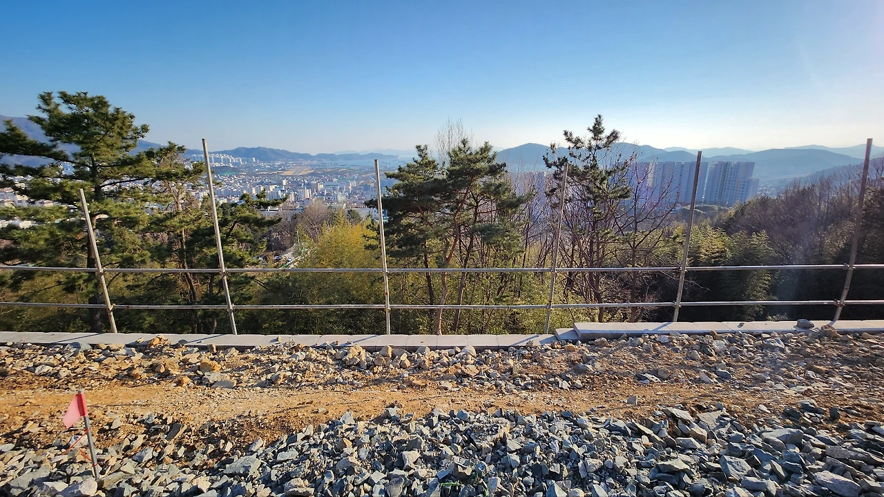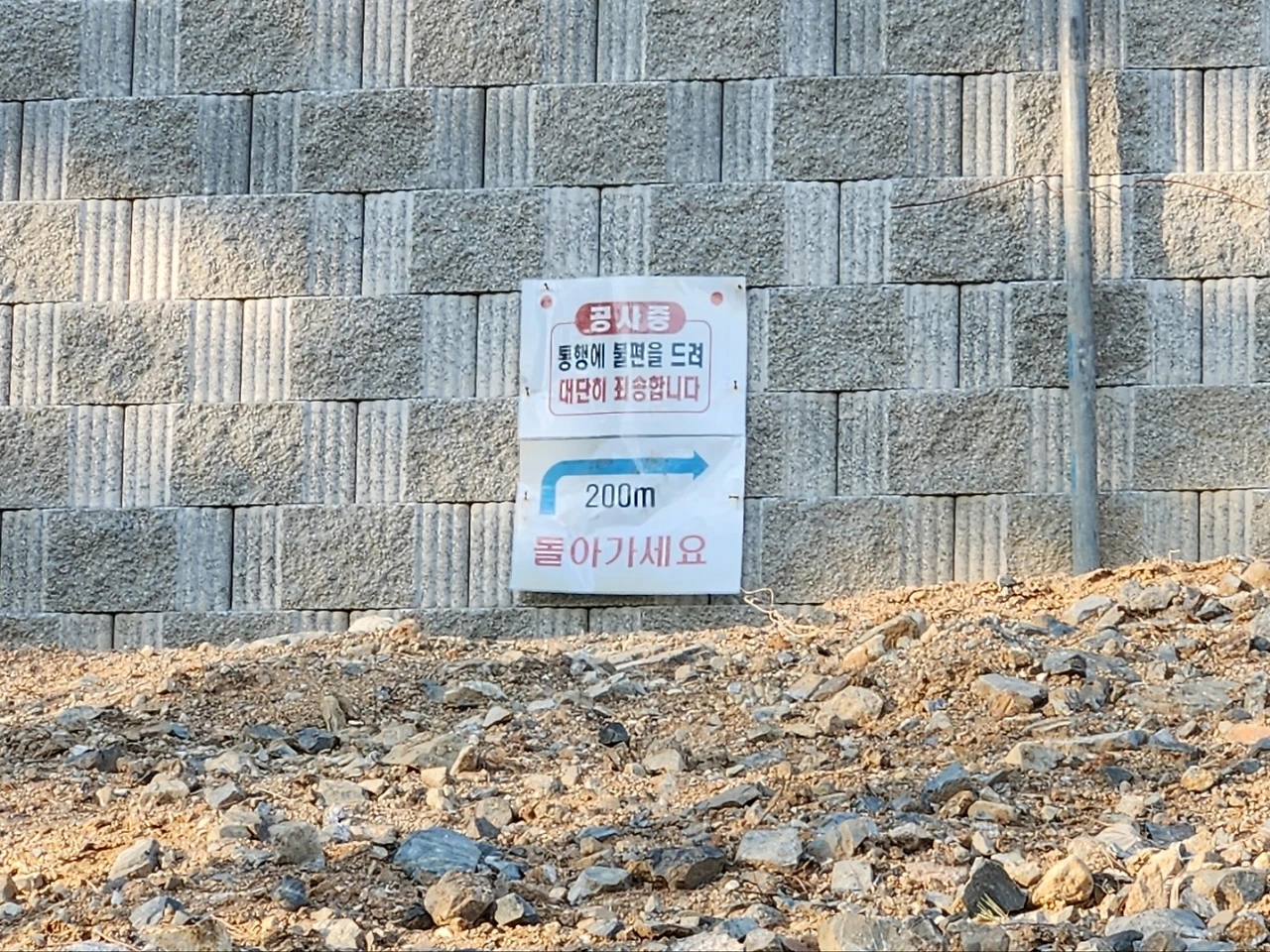 휴일이라 공사가 진행되고 있는 상황이 아니었기에 저는 아버지와 아이들과 함께 공사현장을 가로질러 구경을 하러 가보기로 했습니다. 놀랍게도 정상적인 등산로는 이미 파괴되어 아직 제대로 된 우회로도 만들어지지 않아 엄청나게 불편하게 돌아서 올라갑니다.
