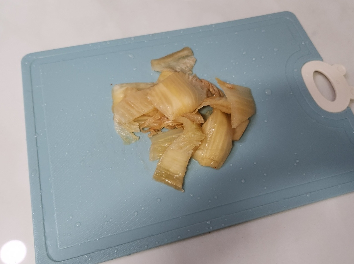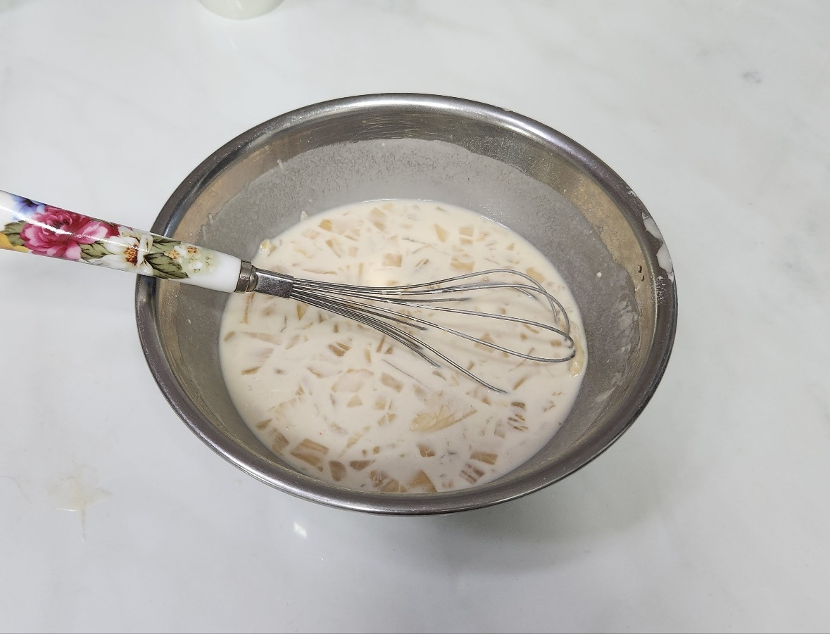 거기에 아삭한 식감을 조금이나마 확보하기 위해 배추김치를 씻어서 잘게 썬 뒤집어넣습니다. 이렇게 반죽은 마무리되었습니다.