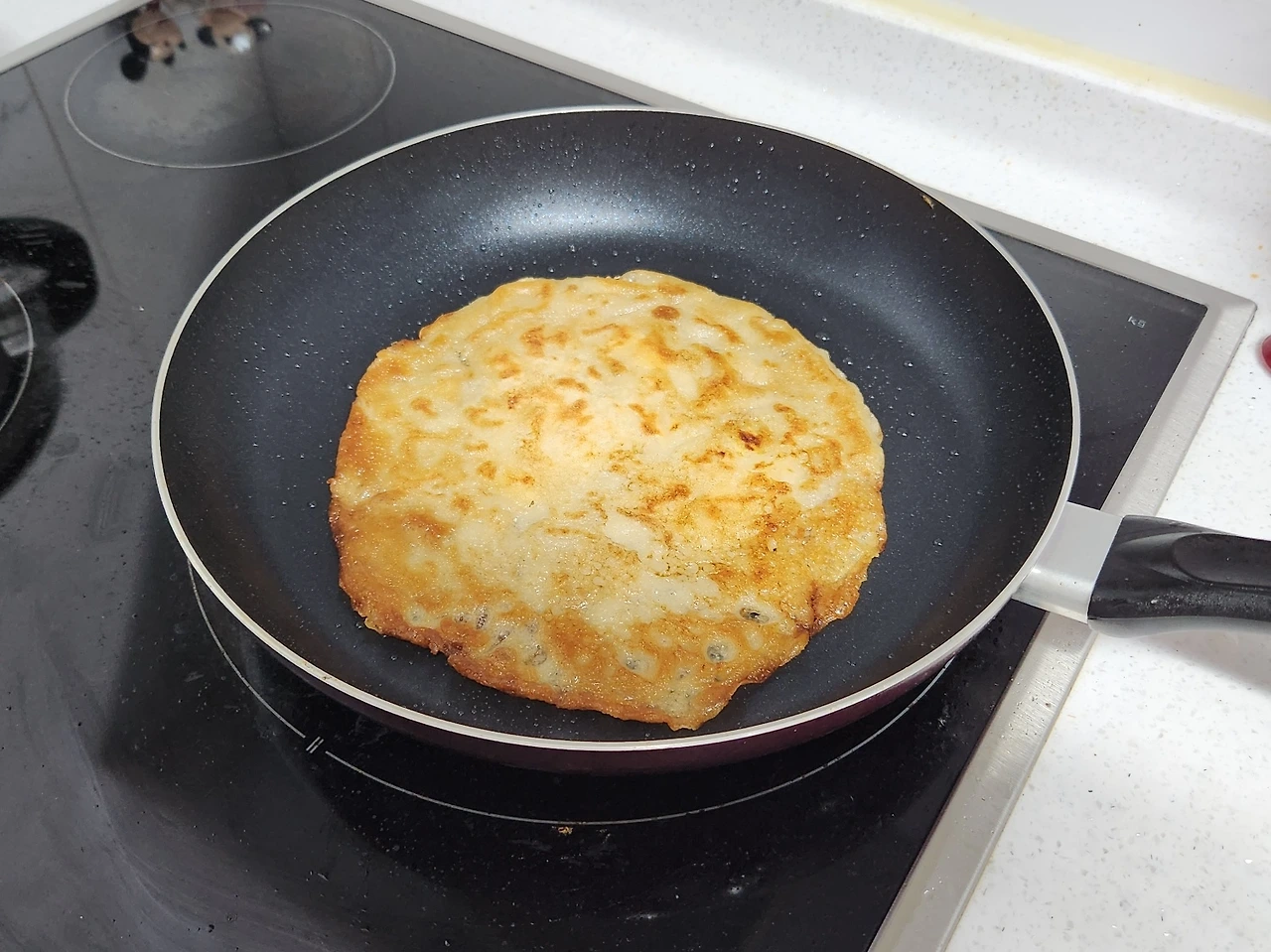 이번에는 기분 좋게도 뒤집개 없이 완벽하게 프라이팬으로 손목스냅으로 전을 뒤집는 데 성공합니다. 이걸 영상으로 찍었어야 하는데 원통할 따름입니다.
