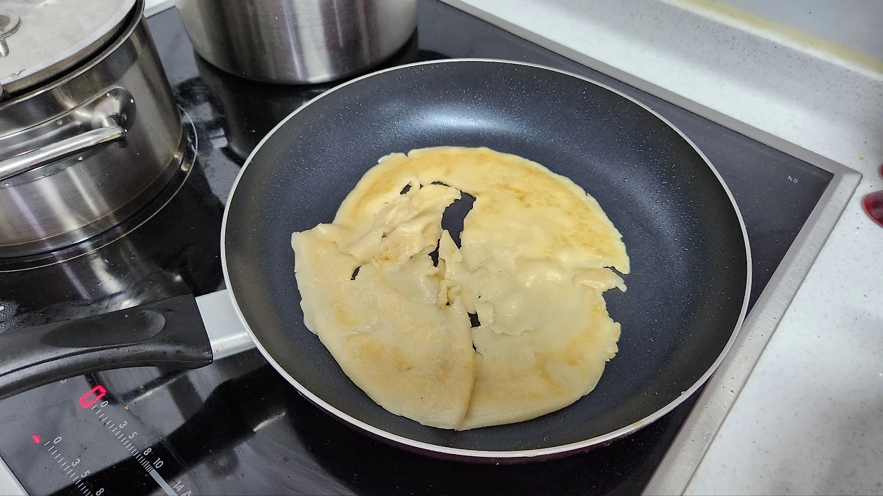 1차 시기입니다. 기름을 두르고 반죽을 부은 뒤 구워봅니다. 제가 봐도 처참한 수준입니다. 일단 두 개의 뒤집개로 뒤집기를 시도하는데 전이 찢어져버리고 맙니다. 제 마음도 함께 찢어지네요. 과학시간에 배웠던 지구가 하나의 대륙이었는데 갈라졌다는 '대륙이동설'이 생각나는 광경입니다.