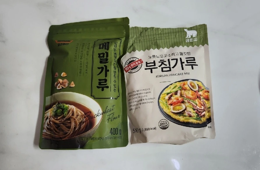 일단 가장 중요한 재료인 메밀가루를 사러 마트에 다녀옵니다. 레시피가 있는 어플에서 원하는 메밀부침가루가 없었기에 구입한 메밀가루와 집에 있는 부침가루를 섞어서 사용합니다.