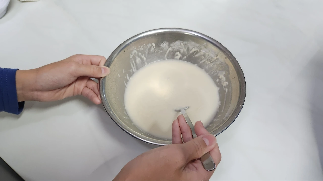 일단 제 나름대로의 황금비율로 섞은 가루에 물도 붓고 아이들에게 저어달라고 합니다.