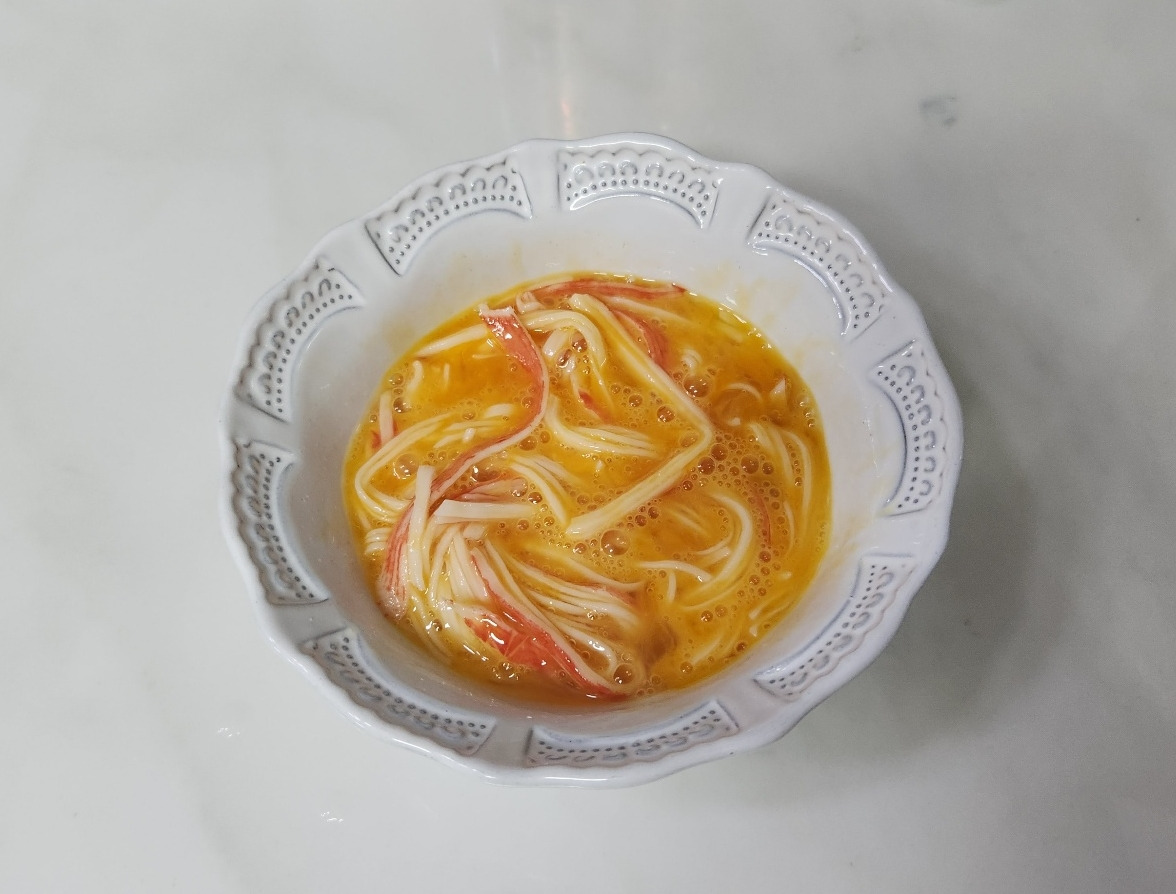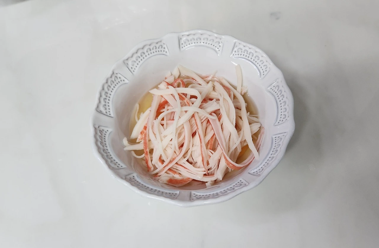 1번에 적어놓은 재료들로 작업을 먼저 시작합니다.게맛살은 먼저 찬물에 좀 담가놓은 뒤 여기에 들어있는 여러 가지의 합성첨가물이 빠지게 만듭니다. 그러고 나서 열심히 찢어서 달걀물, 소금과 함께 섞어줍니다. 이건 간단하죠?
