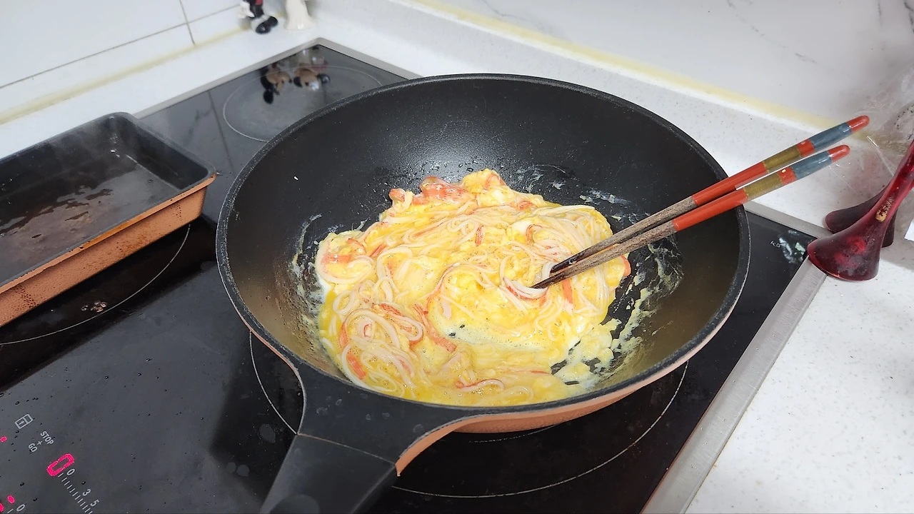 이제는 계란물과 섞은 게맛살을 함께 달궈진 프라이팬에 넣어서 익혀줍니다. 계란을 바짝 익혀버리면 맛이 없을 것이 뻔해 보여서 어느 정도 익으면 곧장 불을 끕니다.