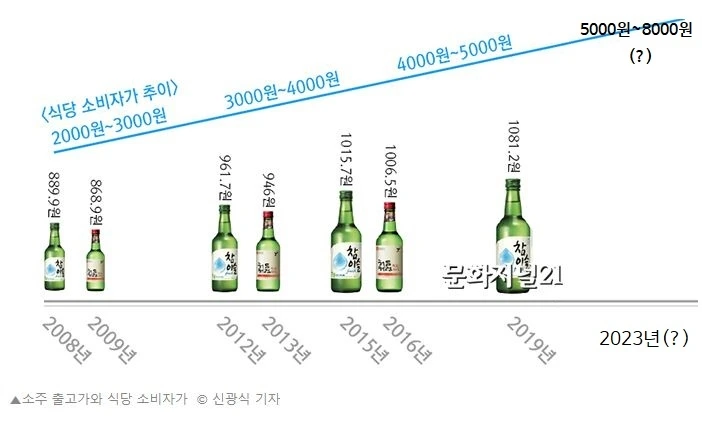 이뿐만이 아니라 서민물가의 바로미터 중 하나인 소주 가격은 이미 천정부지로 치솟는다는 말이 어울릴 정도로 치솟고 있습니다. 출고가격이 오른다는 뉴스를 찾아보면 사실 100원이 채 오르지 않습니다. 하지만 어떻게 식당에서 파는 가격은 어떻게 500원~ 1000원 단위로 오르는지 도무지 알 수가 없습니다. 결국 야금야금 오르다 보니 최근 간 식당에서는 소주 가격이 6,000원인 곳을 보기도 했습니다.