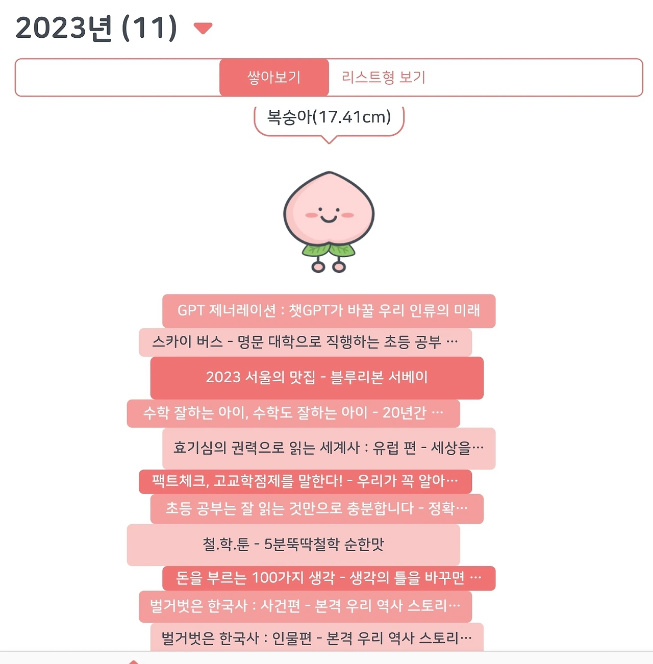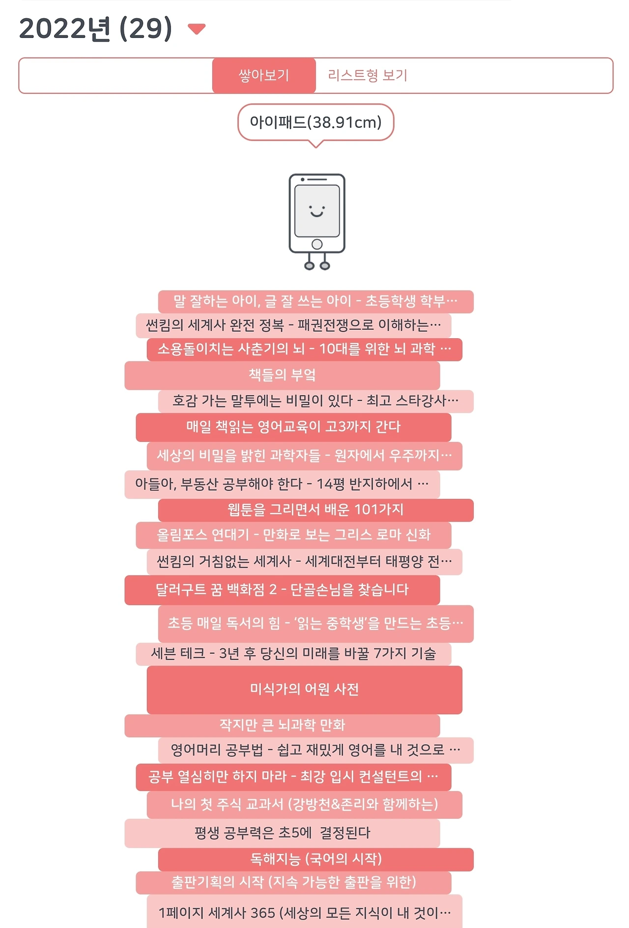일단 올해는 작년의 기록을 넘기는 걸 1차 목표로 삼고 달려보겠습니다. 요즘 아이들에게 하루의 활동 중에 책을 1순위로 하라는 이야기를 많이 해서 어쩔 수 없이 저도 거기에 보조를 맞춰야 하는 상황이니 서로 긍정적인 효과가 있을 듯하네요.