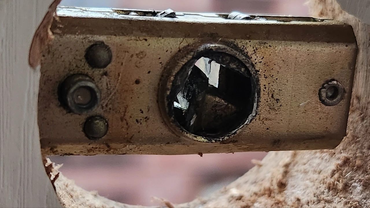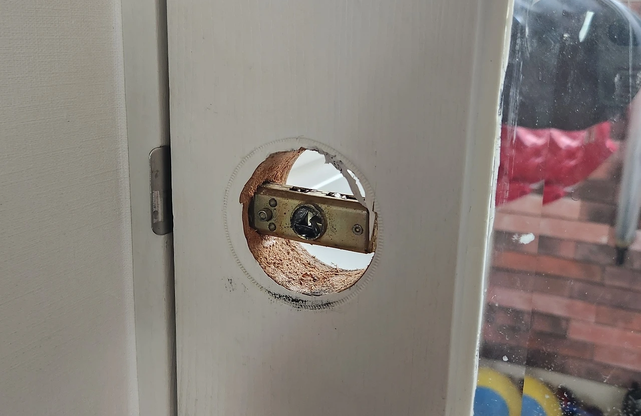 5분이 넘도록 낑낑거리면서 문구멍 안쪽에 자리 잡고 있던 레치라는 부속품을 들쑤시기 시작했습니다. 집에서 가지고 있던 드라이버로 이리 찌르고 저리 만져보았습니다. 하지만 아무리 애를 써봐도 딸깍하는 소리와 함께 문이 열리는 극적인 상황은 일어나지 않았습니다. 점점 등에 땀이 흐르기 시작했죠.