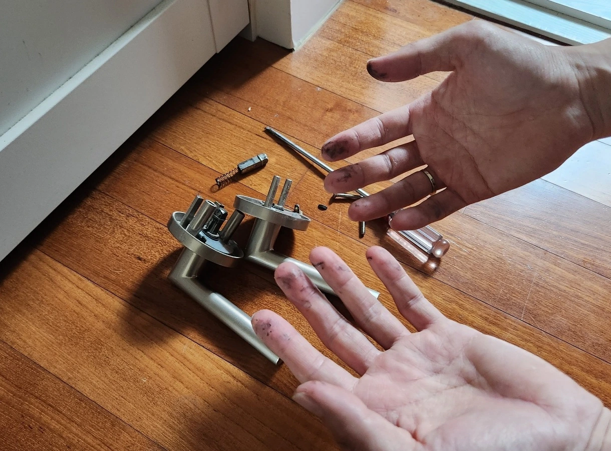 그런데 이게 웬일인가요? 손잡이만 분리되면 문을 열 수 있으리라고 생각한 것은 큰 오산이었습니다. 손잡이는 너무 쉽게 분리되어 안쪽과 바깥쪽의 바닥에 떨어졌지만 문제는 결코 해결되지 않았습니다.