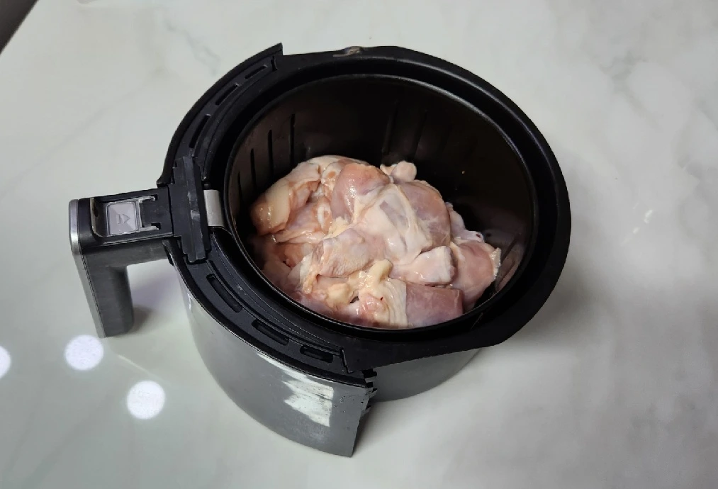 일단 닭을 꺼내서 밑간을 가볍게 한 뒤 에어프라이어에 초벌구이처럼 익혀줍니다. 아시다시피 기름에 바로 튀기면 브랜드 치킨이고 오븐에 익히면 굽ㅇ치킨 스타일인데 이 작업을 둘 다 하게 되면 푸ㅇ닭 스타일입니다. 닭고기 자체에 든 기름이 많기에 건강을 위해 푸ㅇ닭 스타일로 조리해 보기로 마음먹었습니다. 물론 확실히 손이 많이 가긴 합니다.