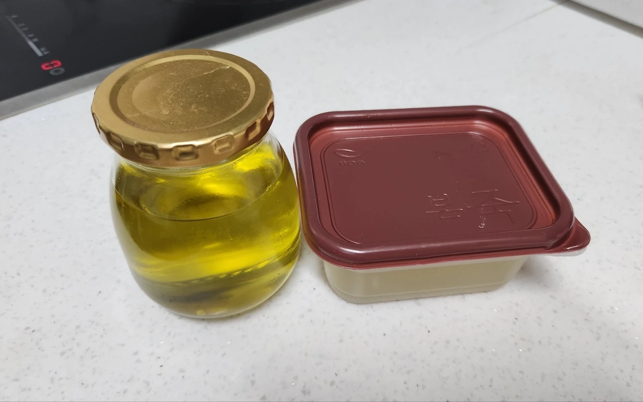 맛있게 먹긴 했지만 마무리 정리를 하느라 애를 먹었는데 그중 하나가 튀김에 쓴 기름의 처리였습니다. 찌꺼기를 잘 걷어낸 뒤 이렇게 작은 용기에 나눠서 담았습니다. 다시 하라고 하면 안 하겠지만 아이들도 좋아하고 기름이 아까워서라도 조만간 한 번 더 만들어먹으려고요.