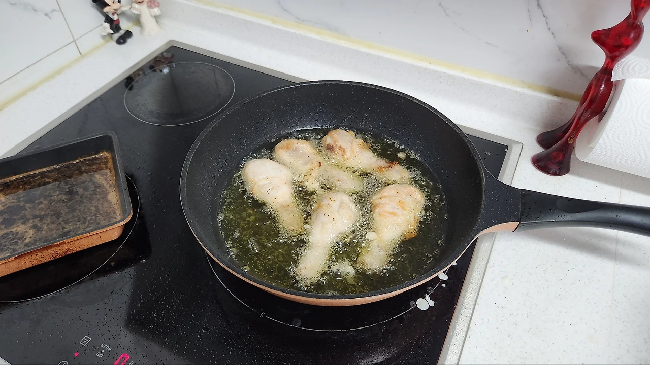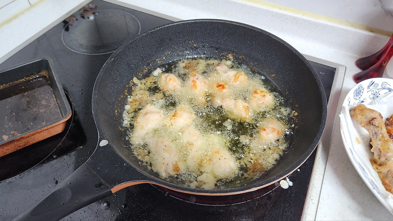 1차로 익히고 나온 헐벗은 다리와 닭봉에게 튀김가루와 전분가루를 섞은 튀김물로 옷을 입혀줍니다.