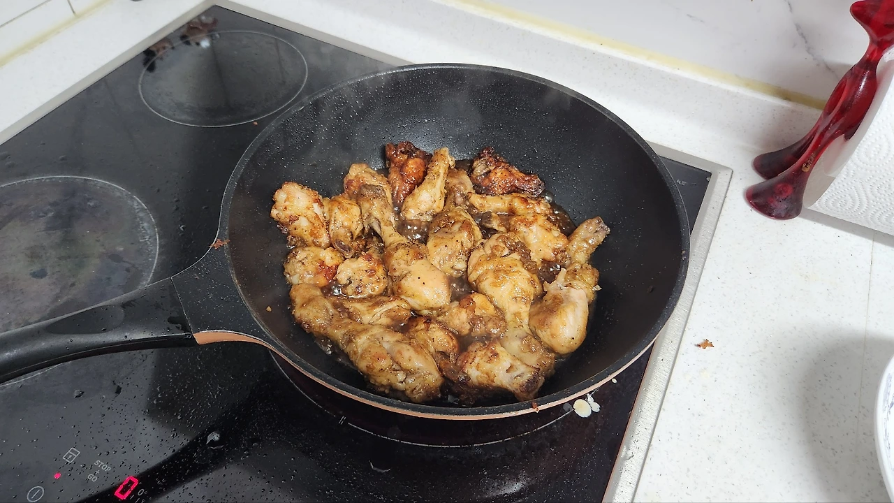 화들짝 놀라서 온도를 조금 더 낮춘 뒤에 순차적으로 닭다리를 하나씩 넣기 시작했습니다. 그리고 그 옆에서는 이 요리의 가장 핵심공정인 소스를 끓이는 작업도 병행했죠. 자글자글 튀겨지는 닭을 보면서 이런 생각도 듭니다. 이미 시켜먹는 것보다 비용이 오버되었겠다고 말이죠.