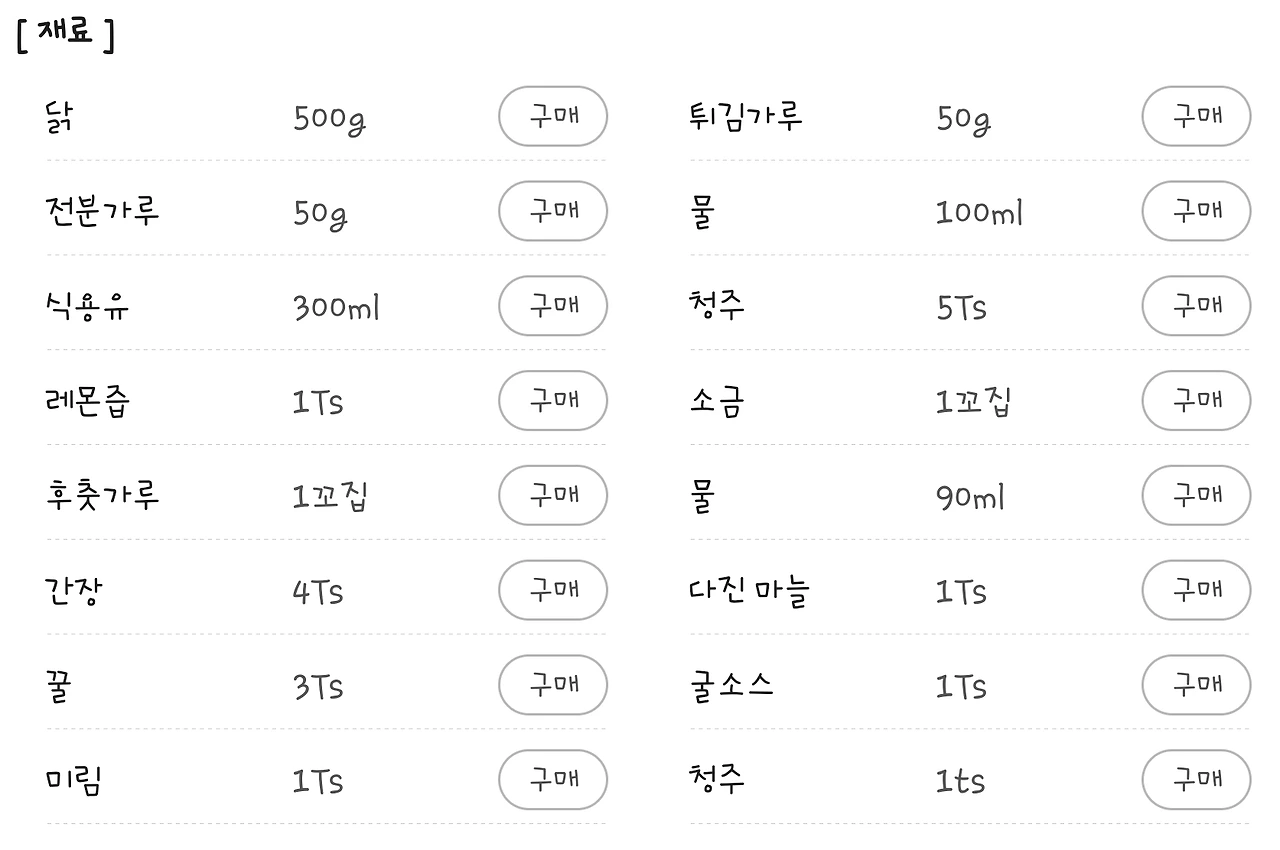 어플로 허니콤ㅇ의 레시피가 있는지 검색을 해봤습니다. 생각보다 재료가 많이 필요합니다. 다행히 집에 있는 재료들이 대부분이어서 튀김가루와 미림만 구매했습니다. 하지만 여기서 또 추가적인 지출이 발생하는군요. 크윽... ㅜㅜ