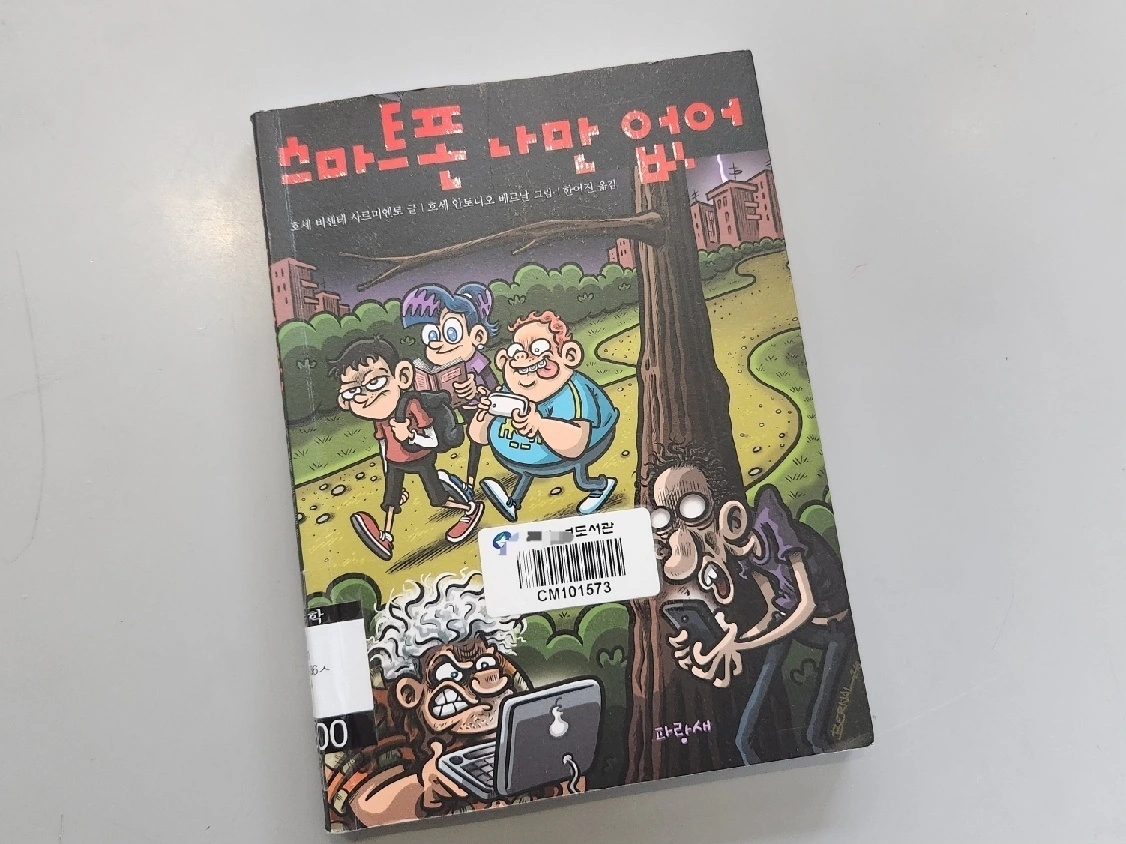<스마트폰 나만 없어>라는 제목의 책입니다. 바로 스마트폰에 얽힌 이야기를 다룬 스페인 작가의 작품인데요. 아이들이 처음 표지를 보더니 그림이 너무 무섭다면서 보지 않으려 했습니다. 그래서 겨우 달래서 절충안을 내놓은 것이 책의 그림을 같이 보지 말고 제가 소리 내어 읽어주면 그걸 들어보기로 한 것입니다.