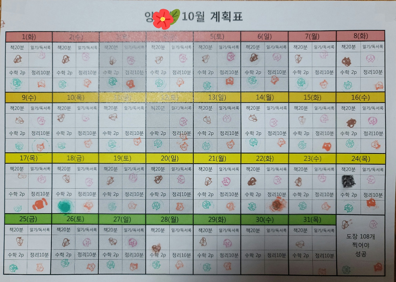 둘째, 부모가 솔선수범할수록 성공할 확률은 높습니다. 부모가 함께 도전한다는 것은 아이들의 참여를 이끄는 데 가장 좋은 밑거름입니다. 저 역시 아이와 함께 계획표를 작성해서 같이 해나가고 있습니다.