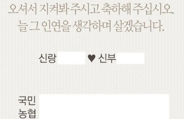 그리고 또 하나 재미있었던 점은 이번 결혼식의 청첩장에 계좌번호가 적혀있었다는 사실입니다. 제가 결혼했던 2009년에 아버지께서 청첩장에 계좌번호를 넣으셨다가 지인들에게 어마어마한 비난을 받으신 적이 있거든요.
