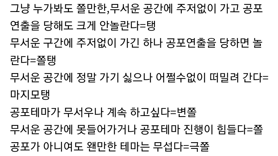 생각보다 방탈출 카페가 공포테마의 비율이 높다는 것을 알고 진지하게 고민이 되기 시작했습니다. 링도 생각보다 많이 무서운 편이 아니라는 이야기에 더 부담감이 느껴졌죠. 저는 생각보다 겁이 많다는 사실을 그제야 깨닫게 되었던 겁니다. 저는 아래의 기준으로 따지면 쫄에 가깝더라고요.