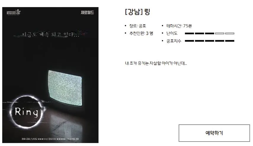 그런데 생각보다 무서운 방탈출 테마가 많다 보니 쉽게 함께 하겠다며 손을 들기도 힘들었죠. 제가 지난번에 갈지 말지 고민하다가 하마터면 갈 뻔한 테마제목 중 하나도 <링>이었습니다. 맞습니다. 바로 우물에서 나와서 tv 밖으로귀신이 나오는 그 링입니다.