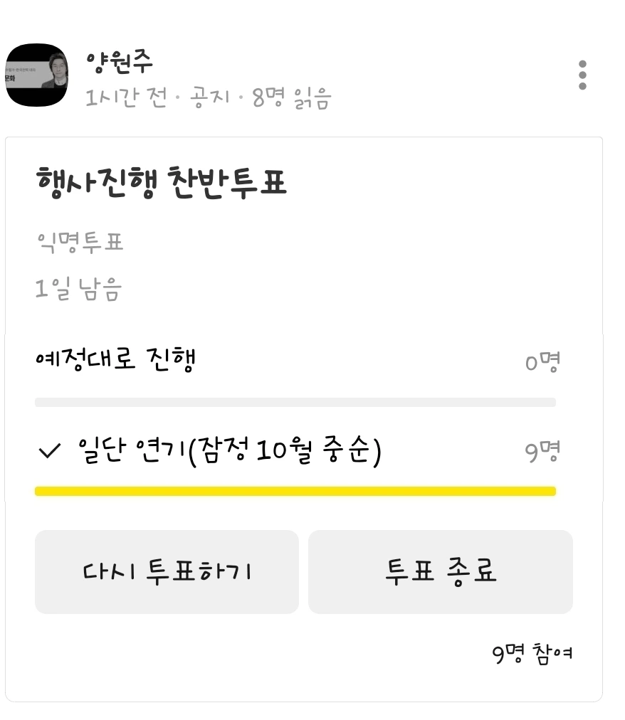 결국 학교 측과 이 투표결과를 공유한 뒤 최종적으로 협의를 마치고 일정을 연기하기로 결정했습니다. 준비한 것이 너무 아깝긴 했지만 어쩔 수 없는 일이었습니다. 비가 와서 혹시라도 행사 중에 안전사고가 나는 것보다는 훨씬 나으니까요.
