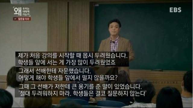 안타깝게도 다른 수강생들은 조심스러워하는 모습이었습니다. 그런 모습을 탓할 수는 없습니다. 지금까지 우리는 계속 질문을 하기에 쉽지 않은 사회적 환경에 노출되어 교육받아 왔으니까요. EBS 다큐프라임에서도 '질문하지 않는 대학생'에 대해 언급하는 장면이 나옵니다.