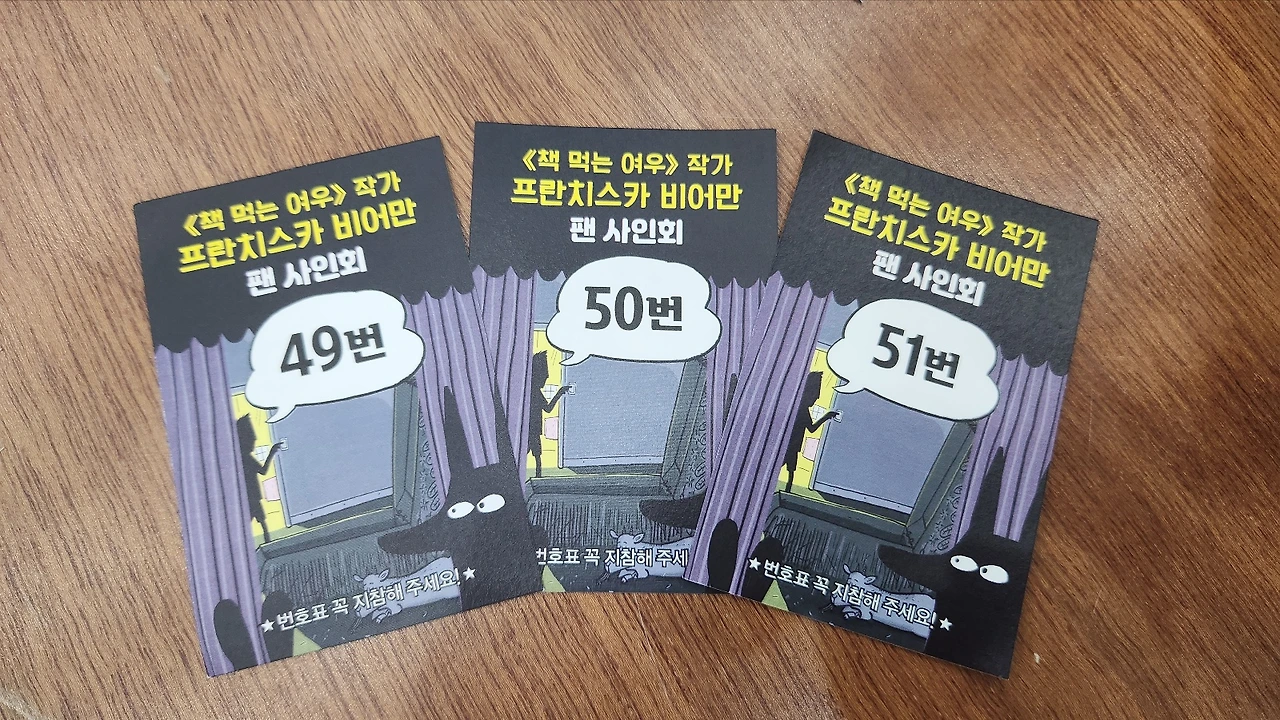 마지막에는 입장할 때 받은 번호표 순서대로 사인을 받는 시간이었습니다. 아이뿐만 아니라 청소년, 심지어 어른까지도 팬층이 두터운 분이었기에 이 시간도 오래 걸렸습니다. 저희는 100명이 넘는 순번 중에서 중간 정도를 받았죠. 1호, 2호 그리고 저입니다.