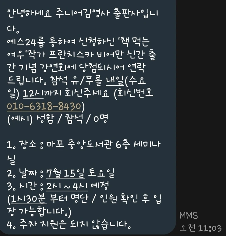 감사하게도 강연회에 정상적으로 신청이 잘 되어 출판사에서 연락이 왔습니다. 기대감이 점점 커지는 느낌입니다.