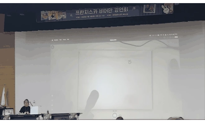 비어만 작가님이 등장하시고 강연회는 신작에 대한 간단한 소개를 중간까지만 하고 실습으로 바로 이어졌습니다. 비어만 작가님의 이야기를 독일어 통역을 해주시는 선생님이 전해주시는 거죠. 여담이지만 지금 생각해 보면 그날이 태어나서 가장 길게 독일어를 들은 날이 아닌가 싶기도 합니다.