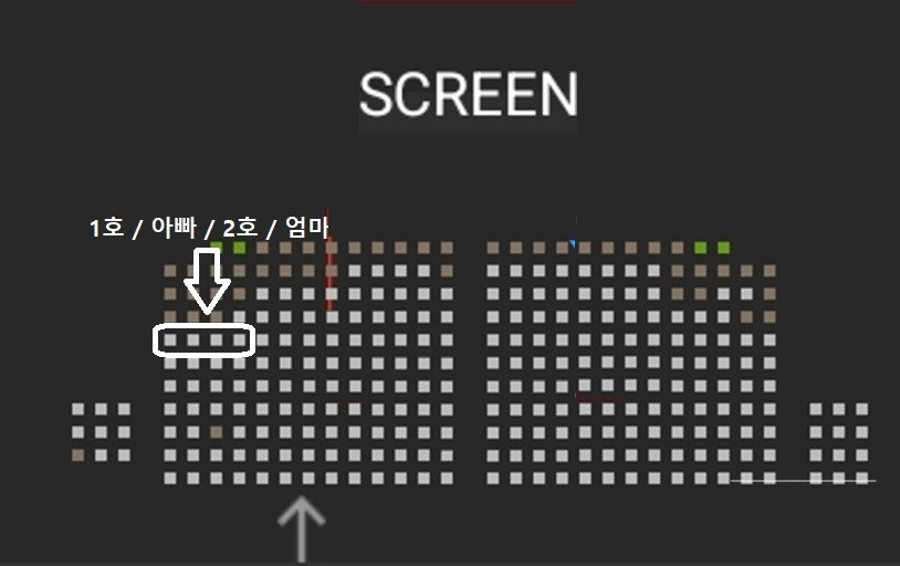 그렇게 자리를 배정한 이유는 2호보다 1호가 화장실에 상대적으로만 보면 좀 더 자주 가는 편이었기 때문이며 제가 아이들 가운데에 앉은 이유는 아이들에게 중간중간 영화내용을 설명해 주기 위해서였습니다.