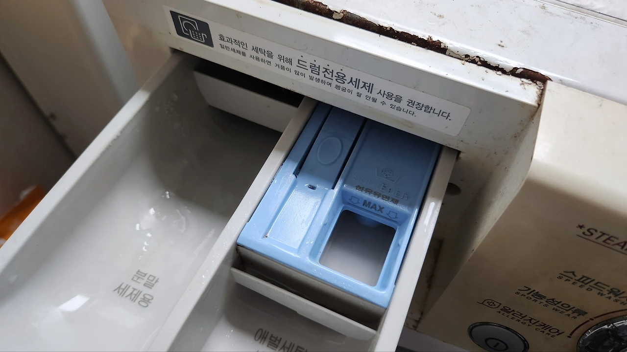 사건의 시작은 집에서 사용하고 있던 드럼세탁기의 섬유유연제를 넣는 구멍에 물이 고여있다는 사실을 발견하면서부터였습니다.