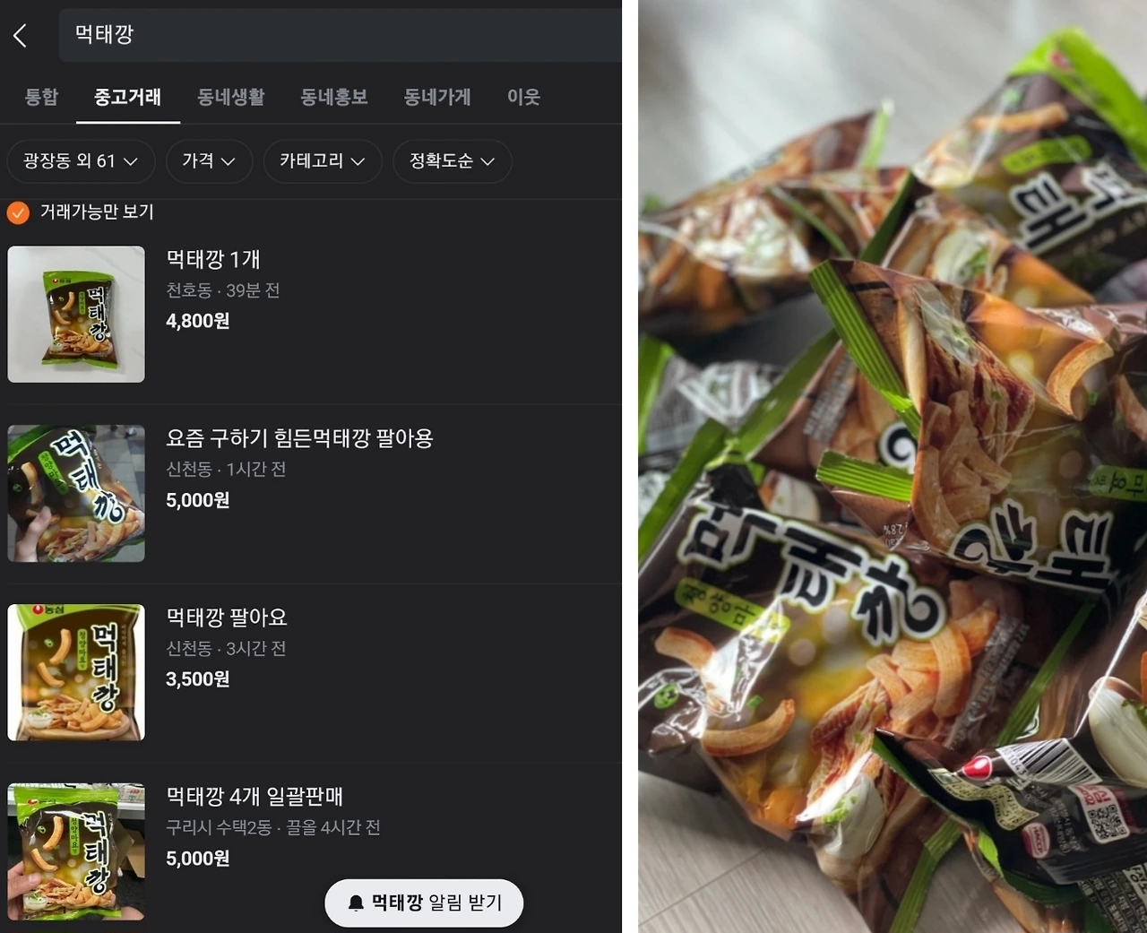 그런데 문제는 이 먹태깡으로 인해 이상하리만큼의 품귀현상이 일어나고 있다는 점입니다. 일반 마트에서는 보통 먹태깡을 1개에 1,700원에 판매한다고 합니다. 이 제품이 구하기 어렵다 보니 온라인상에서는 가격을 붙여서 판매하는 기현상이 일어나고 있었죠.