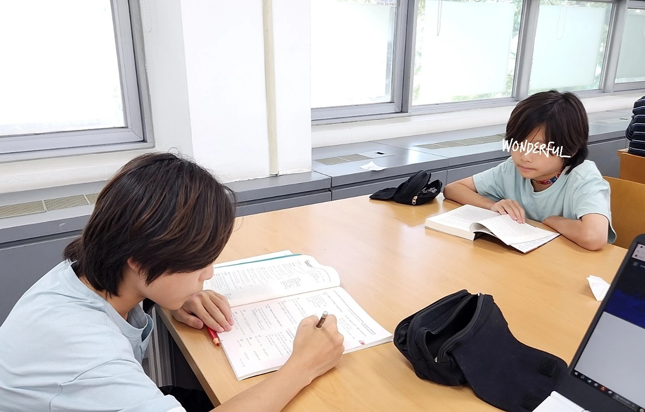 공공도서관 열람실로도 가봤습니다. 일단 예전에 엄마와 함께 갔던 칸막이형에서는 집중이 잘 되지 않았다고 합니다. 소곤거리면서 수학문제를 상의하다가 다른 분께 지적을 받기도 했다더라고요. 이번에는 개방형 열람실로 갔는데 조용하게 꽤 잘하는 편입니다. 그런데 30분 정도 만에 집중력을 잃고 서로 흘끔흘끔 쳐다보기 시작합니다.