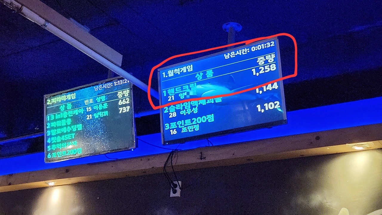 때마침 낚시터에서는 손님들이 계속 머무르게 하기 위해 다양한 상술(일명 이벤트)이 펼쳐지고 있었습니다. 그중에서 월척게임은 시간 안에 가장 무거운 물고기를 잡은 손님에게 상품을 주는 방식이었는데 제가 오자마자 잡았던 물고기가 1.258kg으로 가장 무거웠던 모양입니다. 결국 1등을 하게 되었죠.