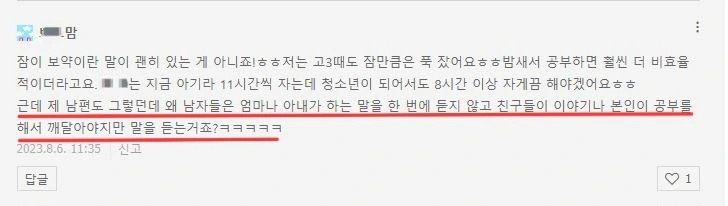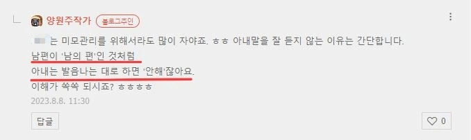 이렇게 잘 알아봤으면 좀 더 현명하게 댓글에 대한 답을 할 수 있었을 겁니다. 그런데 저는 아까 위에 남긴 댓글에서 말씀하신 "남편은 왜 엄마나 부인의 말을 듣지 않는가?"라는 질문에 대한 답을 이런 대댓글로 남기고 말았죠.
