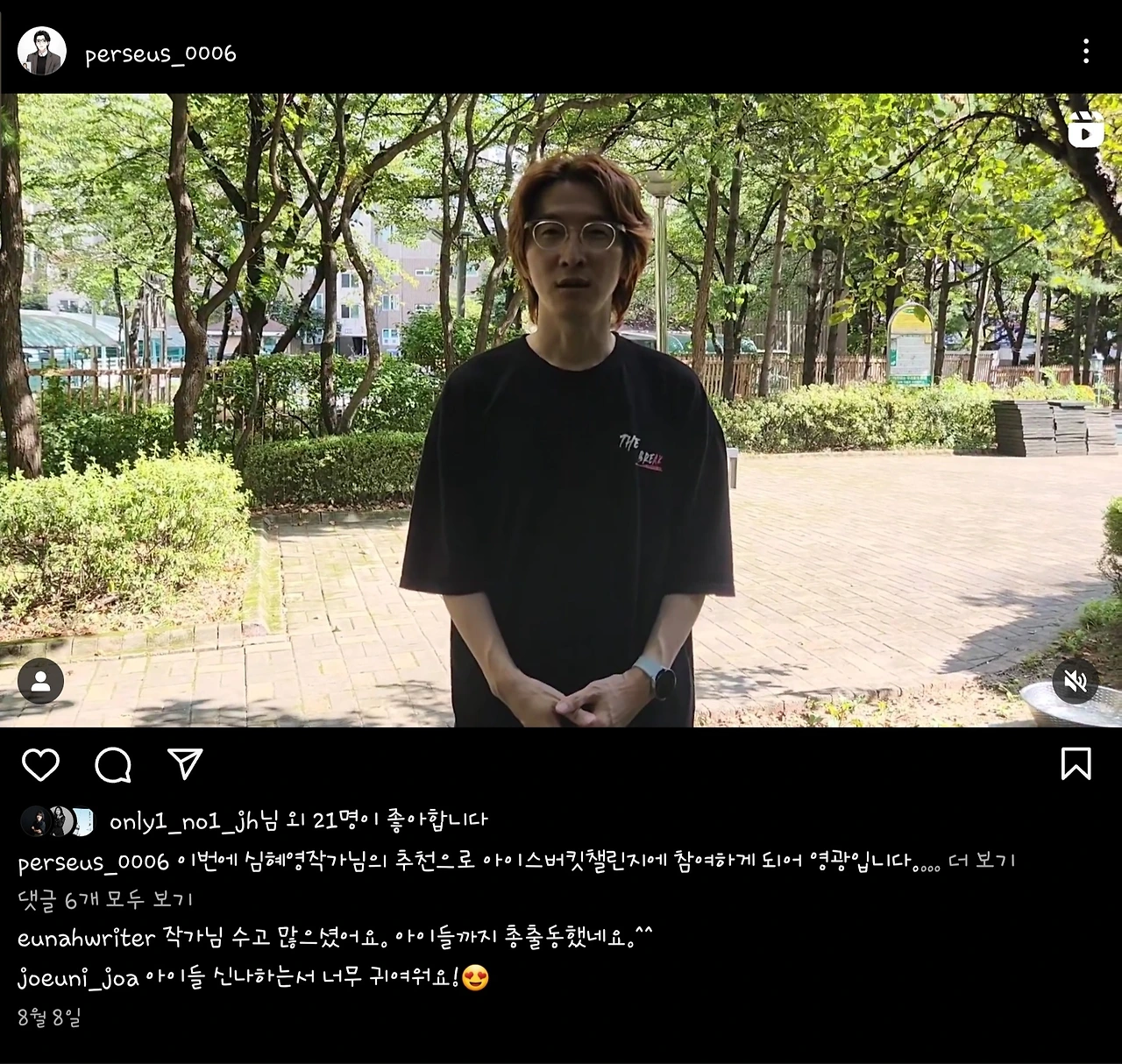 심혜영 작가님 자신이 '아이스버킷 챌린지' 지목을 받아서 할 예정인 저를 데 다음 주자로 지목을 해도 되겠느냐는 말씀이었습니다. 자신이 지목을 받으면 세 사람을 지목해서 널리 알리는 것이 이 이벤트의 취지더라고요.