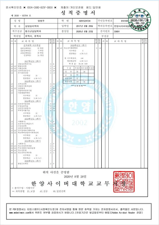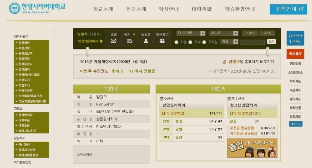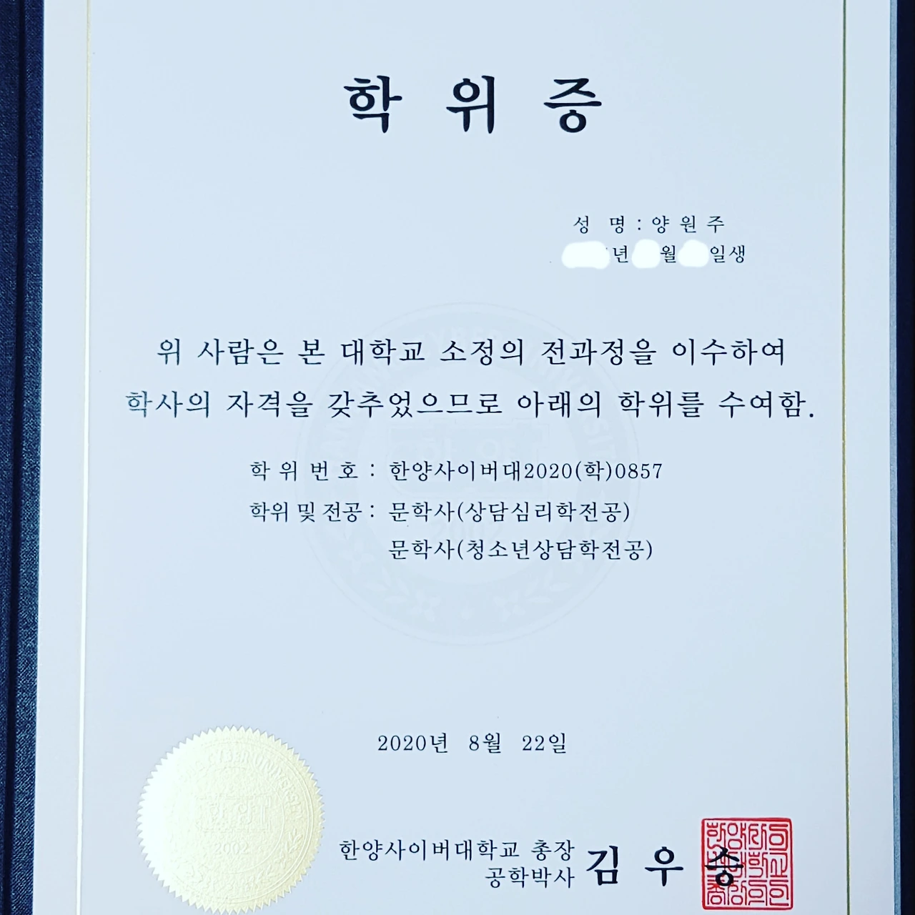 저는 몇 년 전에 한양사이버대학교에서 상담심리학과 청소년상담학 학사과정을 수료했습니다. 회사 다니면서 공부를 하려니 쉽지는 않았지만 운 좋게 어려운 공부를 잘 마무리할 수 있었습니다.