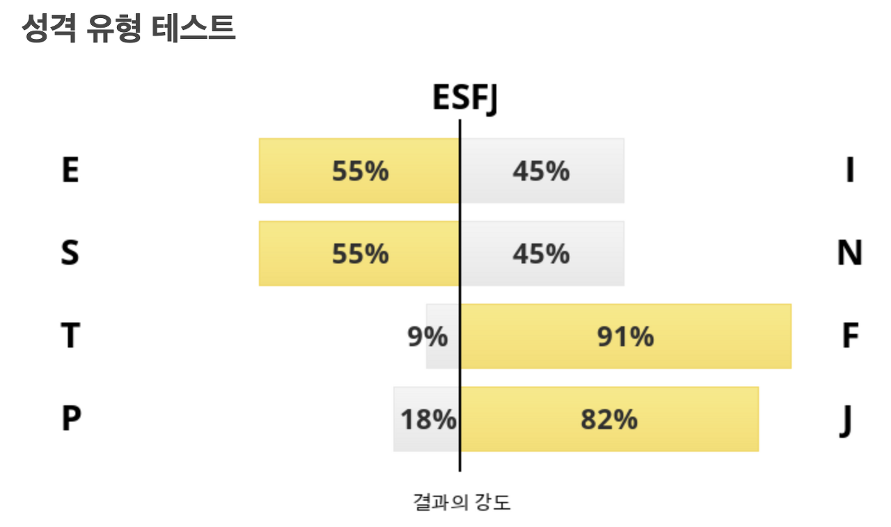 제가 오늘 또 검사를 한다면 ESTJ 나 ENFJ가 아닌 어떤 결과가 나올지 알 수 없습니다. 한쪽으로 극단적으로 쏠린 성향이 아닌 이상 질문 하나의 답변에 따라 E와 I, S와 N, T와 F, P와 J는 얼마든지 왔다 갔다 할 수 있으니까요.