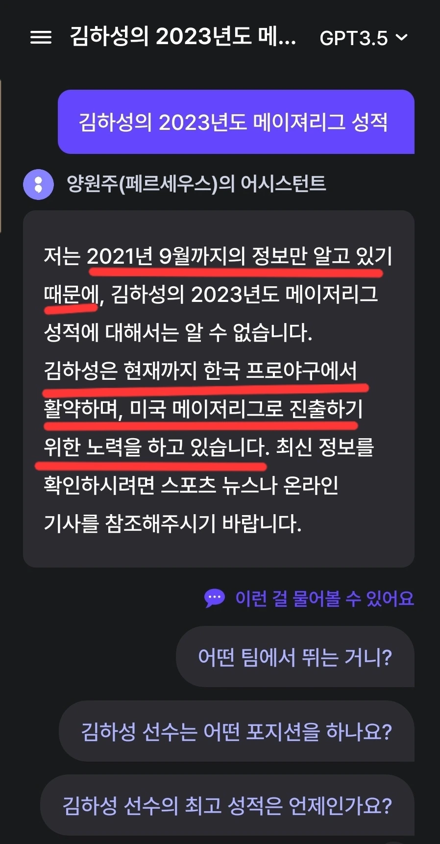 김하성 선수는 이미 2021년부터 샌디에이고에서 뛰고 현재 3년 차를 보내고 있는 상황이었죠. 2021년의 정보 밖에 없는 챗봇에게 질문을 더 해야 하는지에 대한 의구심이 생기기 충분했죠.